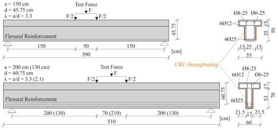 A total of 5 unstrengthened reference-reinforced concrete structures and 25 beams strengthened with carbon CRC were planned to be tested for their shear capacity (Table 1). The following influencing factors on the load-bearing behavior were experimentally examined: