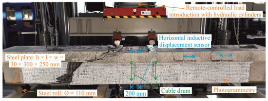 Differing from [11] (three-point bending tests), four-point bending tests were conducted to better identify the triggering failure mechanisms (Figure 3 and Figure 4). The beams were consistently reinforced in the longitudinal direction. Except for two slender T-beams, all test specimens were tested with a shear span-to-depth ratio (distance a between end supports and load application point to the static effective depth d) λ = 3.3. A shear span-to-depth ratio λ between 2.5 and 3.5 typically results in failure of the tension tie (stirrup reinforcement) of an unstrengthened RC structure. The PB-S series was supplemented with two beams with a reduced shear span-to-depth ratio of 2.1. To confirm the achieved test results, each test configuration was tested twice.
