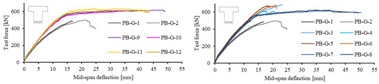 The one-layer strengthened compact beams PB-G-3/-4 with strengthening on the web side faces (II) and fiber strand direction at 0°/90° to the component’s longitudinal axis achieved an average failure load of 650.5 kN, which is 32% higher compared to the unstrengthened reference. In both cases, failure occurred due to the yielding of the stirrups and the development of concrete cracks on the underside of the web (see Figure 9). In comparison to the PB-G-9/-10 strengthened with SITgrid 040, the mode of failure changed from flexural to shear failure. This material-dependent change can be attributed, among other factors, to the geometry and the reinforcement ratio of the biaxial carbon grid solidian GRID Q85/85-CCE-21. This biaxial grid not only strengthened the shear capacity but also the flexural capacity. Consequently, the biaxial carbon grid led to a change in the plane of deformation throughout the cross-section height and increased the flexural capacity.