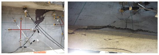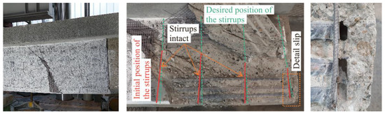 In the case of the slender beams (PB-S-9/-10), an average failure load of 846.0 kN was experimentally confirmed. Compared to the unstrengthened specimen, this represents a 41% increase in load capacity. The failure of specimen PB-S-10 occurred at a mid-span deflection of approximately 25 mm and was characterized by delamination of the strengthening layer in the lower part of the beam web, see Figure 7. No tensile failure was observed within the carbon concrete strengthening layer or in the steel stirrups. Evidence of this shear failure mode can also be found in [37], where it is defined as ‘delamination of the strengthening layer’. Transverse tensile stresses and bond stresses (see cross-sectional plane of a spatial truss in Figure 8) between the strengthening layer and the existing concrete likely triggered the failure mechanism, see e.g., [9,51].