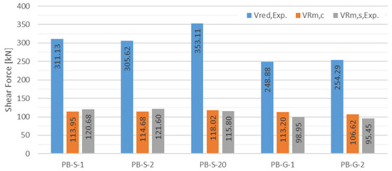 The verification of the shear resistance of the reference specimens is carried out in accordance with EC2 [39] and the specifications of Brückner [11]. The following Figure 13 provides a comparison of the experimentally obtained shear capacities Vred,Exp with the calculated shear resistances. The calculated shear resistances without transverse reinforcement are represented by VRm,c. The shear resistances of the transverse reinforcement or the shear crack angle θ were determined based on the failure load (VRd,s = Vred,Exp) using VRm,s,Exp.