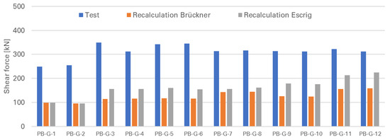 In Figure 14 (PB-G) and Figure 15 (PB-S), the experimental and calculated shear capacities according to Brückner [11] and Escrig [34] are presented. It should be noted that the approach described by [34] allows for higher load-bearing capacities in the strengthened components of the PB-G series. For the PB-S series, the calculated load capacities are generally at a similar level, with the exception of the two-layer strengthened components PB-S-11/-12. In the case of the two-layer test configuration, lower load capacities are achieved using the Escrig [34] approach. Both models significantly underestimate the experimental shear capacities.
