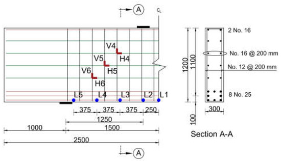 A deep beam model was developed for the purpose of verification against published experimental data [20]. The deep beam model had a rectangular cross-section of 300 mm in width and 1200 mm in depth. The length of the beam was 5000 mm with an effective span of 3000 mm. The shear span-to-depth ratio (a/h) was 1.04, resulting in a shear span of 1250 mm and a constant moment region of 500 mm. Figure 1 shows the concrete dimensions, the details of reinforcement, and the location of monitoring points on the GFRP reinforcing bars of the modeled deep beam. The beam was reinforced with eight longitudinal GFRP reinforcing bars with a diameter of 25 mm (No. 25) at the tension side and two GFRP bars with a diameter of 16 mm (No. 16) at the compression side. The concrete cover to the center of the tensile GFRP reinforcement was 100 mm, rendering an effective depth of d = 1100 mm. The web reinforcement included vertical and horizontal GFRP bars with diameters of 12 mm (No. 12) and 16 mm (No. 16), respectively, placed at a spacing of 200 mm in both directions. Steel plates (200 mm × 300 mm × 30 mm) were placed at the load and support points to reduce the stress concentration at these locations. The cylindrical compressive strength (f’c) of the concrete was 37 MPa. GFRP bars No. 12, 16, and 25 had cross-sectional areas of 127, 198, and 507 mm2; guaranteed tensile strengths of 1019, 1184, and 1000 MPa; and elastic moduli of 50.0, 62.5, and 66.4 GPa, respectively [20]. It is noteworthy that the bent portions of the vertical stirrups had a guaranteed tensile strength of 459 MPa [20].
