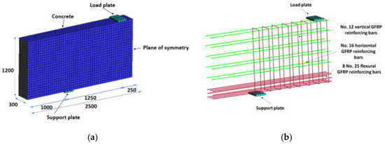 The concrete and steel plates were modeled using solid 3D brick elements, whereas the GFRP bars were modeled as one-dimensional discrete elements embedded into the concrete brick elements. Modeling the reinforcement as discrete elements means that they remain in the uniaxial stress state. It is recommended by the software manual to have a minimum of four to six elements in the shortest dimension of the member to ensure the convergence of the solution, while minimizing the computational time [27]. The shortest dimension of the beam in this study is 300 mm, which corresponds to a minimum recommended mesh size in the range of 50 to 75 mm. A mesh sensitivity analysis was conducted using different mesh sizes of 100, 75, 50, and 35 mm. The difference between the prediction of the model with 50 mm mesh size and that of the models with 100 and 75 mm mesh sizes was within 17%. In contrast, the difference between the prediction of the model with 35 mm mesh size and that with 50 mm mesh size was only 6%, indicating the stabilization of the numerical results. As such, a mesh size of 50 mm was selected to optimize the processing time since further reduction in the mesh size had a negligible effect on the numerical prediction. To take advantage of the plane of symmetry in the geometry and loading condition and reduce the overall computational time, only half of the beam was modeled. The used brick element had a dimension of 50 × 50 × 50 mm, rendering a total of 7200 elements within the half beam model. The movements in the vertical and transverse directions of the bottom steel support plate were restricted by means of a line support placed at the middle of the bottom surface of the plate. Surface supports were used to restrain the movement of the plane of symmetry in the longitudinal direction. The modeled deep beam was loaded by an imposed incremental displacement at the middle of the top steel plate at a rate of 0.1 mm per step. The load and midspan deflection were monitored by means of monitoring points placed at the corresponding locations. The top and bottom steel plates were connected to the beam through fixed contacts. The standard Newton–Raphson iterative solution method was adopted in the analysis. The iteration had to satisfy a tolerance limit of the convergence criteria of 1%. Figure 4a shows the meshed concrete of the modeled deep beam. Figure 4b shows the flexural and web reinforcements of the numerical model, noting that the meshed concrete was not displayed in Figure 4b for clarity.