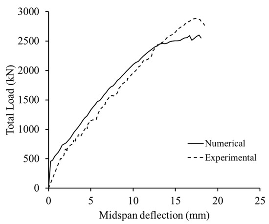 Figure 6 shows a comparison between the predicted and experimental load–deflection response. The response of the deep beam model started by a linear branch followed by a drop at the onset of initiation of cracking at an approximate load of 500 kN. Then, the deflection continued to increase but at a higher rate. There was a deviation between the pre-cracking stiffness predicted numerically and that measured experimentally. This behavior is expected, particularly, for such a large-scale deep beam. The actual deep beam could have had shrinkage cracks prior to testing due to its large surface area, which might have reduced its initial stiffness in the pre-cracking stage. It is noteworthy that the post-cracking stiffness of the beam predicted numerically almost coincided with that measured experimentally despite the probable minor settlement of the supports that could have happened during testing. Due to a progressive development of cracks in the post-cracking phrase, the deep beam model exhibited a quasilinear response that was in alignment with the experimental results. The post-cracking stiffness of the beam predicted numerically almost coincided with that measured experimentally. The experimental and numerical ultimate loads of the modeled deep beam were 2904 kN and 2601 kN, respectively. The difference between the numerical and experimental ultimate loads was within the 10% error band. The experimental and numerical deflection at ultimate loads of the modeled deep beam were 17.3 mm and 17.8 mm, respectively. The deviation between the deflection capacity predicted numerically and that obtained from the tests did not exceed 3%. The differences between the experimental and numerical results were within the typical margin of error considering the variability in the shear test results.