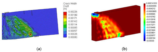The numerical crack pattern and the minimum principal strain in the concrete at the ultimate load are provided in Figure 7a,b, respectively. The contours in Figure 7a show the distribution of cracks. Only cracks with a width ≥ 0.1 mm are marked with black lines since the minimum displayed crack width was set to be 0.1 mm. The numerical prediction indicated initiation of flexural cracks prior to shear cracks. The published data also indicated the initiation of flexural cracks early at 18% of the ultimate load before the development of any shear cracks [20]. Diagonal cracks were then formed in the shear span as the load progressed. Additional shear cracks were developed with an increase in the applied load defining the direction of a concrete diagonal strut between the load and support points. Eventually, DB-S failed by crushing of the diagonal concrete strut formed in the shear span as manifested in Figure 7a,b. Crushing of the diagonal strut in the shear span was verified experimentally in Reference [20].