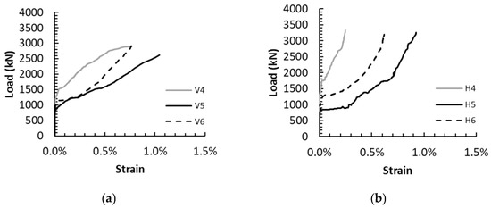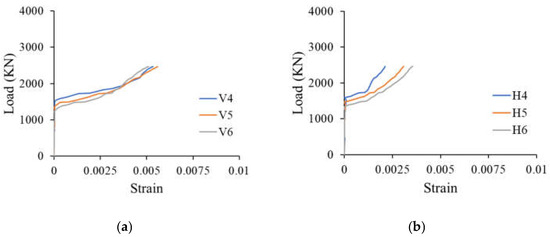 The strains predicted numerically are plotted against the load in Figure 8. The measured GFRP strain responses at the same locations are shown in Figure 9. The numerical results indicated that the vertical and horizontal web reinforcing bars were not strained until shear crack developed in the shear span at a load value of approximately 1200 to 1500 kN. Following the shear cracking, the strain increased almost linearly until the ultimate load was reached. The rate of increase in the vertical GFRP stirrups in all monitoring points was almost identical. The strain in the vertical GFRP stirrups predicted numerically at the ultimate load was approximately 0.7%. The measured strains in the vertical GFRP stirrups at the ultimate load were on average 0.8%. The maximum strain predicted numerically in the horizontal GFRP bars at the ultimate load (approx. 0.4%) was lower than that recorded in the vertical stirrups. The strains measured experimentally in the horizontal bars were on average 0.5%. It is noteworthy that the strain predicted numerically in the horizontal GFRP bars closer to the tension face tended to increase at a higher rate than that of the horizontal bars closer to the compression face (Figure 8). Experimental measurements shown in Figure 9 verified the lower strains in the horizontal GFRP bars closer to the compression face (H4).