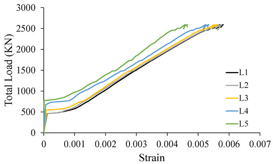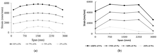 The strains predicted numerically in the flexural reinforcement are plotted against the load in Figure 10. A bi-linear strain response was recorded for the modeled deep beam. The strain response at all locations was insignificantly different, except at the region near the support (L5) having lower strains, verifying the arch action effect. The strain profile at four loading stages, 25, 50, 75, and 100% of the shear capacity, predicted numerically and obtained from the experiment, verified the uniform distribution of strains in the flexural GFRP reinforcement within the beam span except at the support location as shown in Figure 11a,b, respectively.