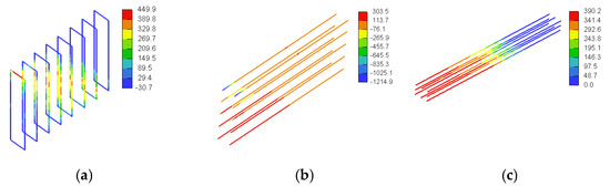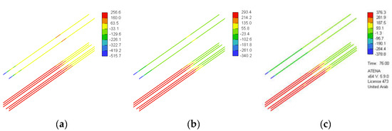Three-dimensional view of stresses in GFRP bars (MPa): (a) vertical stirrups, (b) horizontal web reinforcement, and (c) flexural reinforcement.