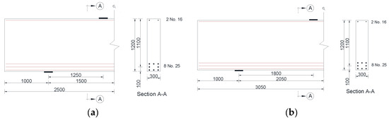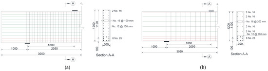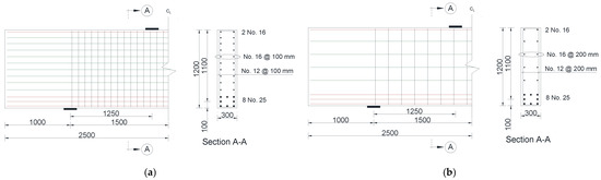 The parameters of the deep beam models without web reinforcement are summarized in Table 2. The variables were the value of a/h and the concrete compressive strength (f’c). The a/h value was either 1.0 or 1.5. The values of f’c were 28, 37, and 50 MPa, representing low (L), moderate (M), and high (H) concrete compressive strengths, respectively. Figure 13a,b show details of reinforcement of the numerical models of this group with a/h values of 1.0 and 1.5, respectively.