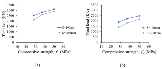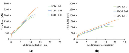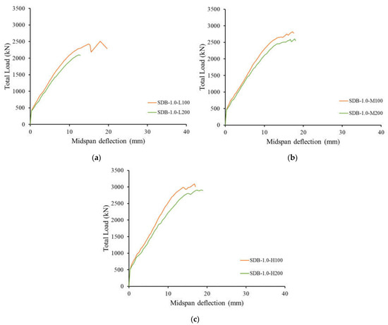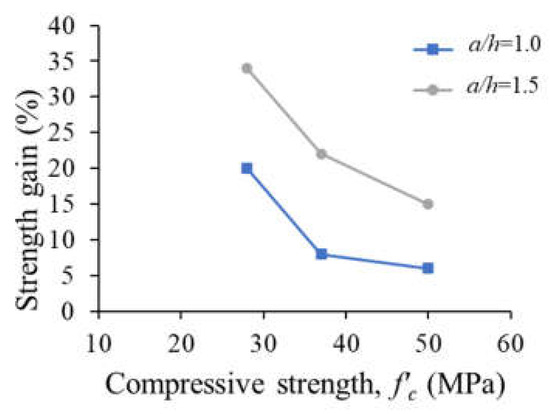 Figure 14a,b show the load–deflection responses of the deep beam models without web reinforcement having a/h values of 1.0 and 1.5, respectively. The beam models exhibited a bi-linear response, irrespective of the values of f’c and a/h. In the first stage, a linear response was recorded until the initiation of flexural cracks, which caused a change in the slope of the load–deflection response. Changing the concrete compressive strength insignificantly reduced the post-cracking stiffness of the beam models. Nevertheless, the beam models with a/h = 1.5 exhibited a reduced flexural cracking load and post-cracking stiffness compared with those of their counterparts with a/h =1.0. The deflection continued to increase with an increase in the applied load until the ultimate load was reached. The beam models with the higher f’c of 50 MPa failed at a deflection capacity greater than that of their counterparts with the low and moderate f’c of 28 and 37 MPa, respectively. Furthermore, the beam models with a/h =1.5 had a higher deflection capacity than that of their counterparts with a/h =1.0.