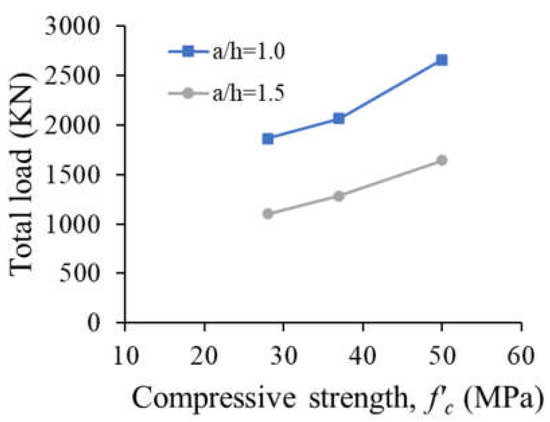 Table 3 presents the ultimate load and the deflection capacity for the deep beam models without web reinforcement. The ultimate loads of the models increased with an increase in the concrete compressive strength. The strengths of the deep beam models SDB-1.0-M and SDB-1.0-H were 11 and 43% higher than that of the model SDB-1.0-L. Similarly, the ultimate loads of the deep beam models SDB-1.5-M and SDB-1.5-H were 17 and 49% higher than that of the model SDB-1.5-L. The ultimate loads of the deep models with a/h = 1.5 were lower than those of their counterparts with a/h = 1.0. The beam models SDB-1.5-L, SDB-1.5-M, and SDB-1.5-H with the low (L), moderate (M), and high (H) concrete compressive strengths showed strength reductions of 41, 38, and 38%, respectively, due to increasing the value of a/h from 1.0 to 1.5. These results indicate that varying the concrete compressive strength had almost no effect on the percent strength reduction caused by increasing the value of a/h from 1.0 to 1.5. The deflection capacity of the beam models with the low and moderate f’c were insignificantly different, irrespective of a/h. The beam models with the higher concrete compressive strength failed at a higher deflection capacity than that of their counterparts with low and moderate concrete compressive strength. Figure 15 shows the effects of f’c and a/h on the strength of the deep beam models without web reinforcement. The ultimate load increased almost linearly with an increase in f’c, irrespective of the value of a/h. The beam models with a/h = 1.0 exhibited higher strengths than those of their counterparts with a/h = 1.5. The strength gain caused by reducing the value of a/h from 1.5 to 1.0 was in the range of 64% with a minimum of 61% and a maximum of 69%.