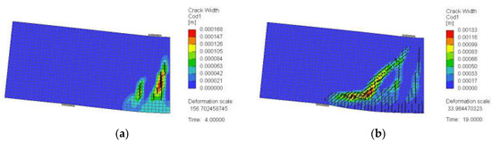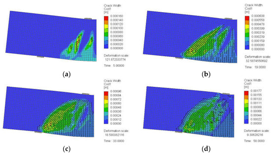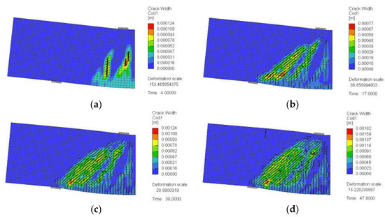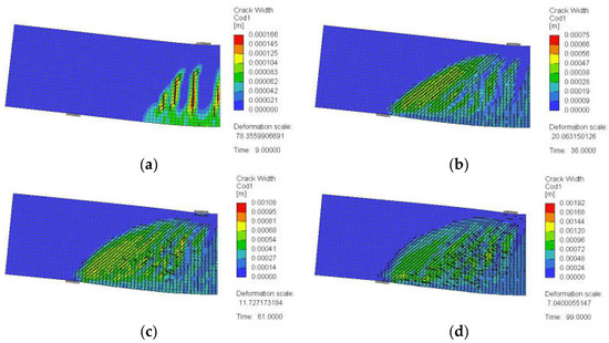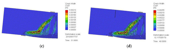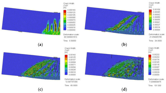 Figure 16 shows the crack development and propagation for a sample deep beam model without web reinforcement (SDB-1.0-M). The crack patterns at different stages of loading (25%, 50%, 75%, and 100% of the ultimate load) are displayed to understand the progress of cracking during loading. In each subfigure, there are contours indicating the distribution of cracks and a legend for the crack width values. Since the minimum displayed crack width was set to be 0.1 mm, only cracks with a width ≥ 0.1 mm are marked with black lines. The beam model exhibited flexural cracks in the midspan and in the shear span region closer to the load point prior to the initiation of any shear cracks. When the load was increased, shear cracks very close to each other simulating almost one unified major shear crack were developed in the shear span with an angle of inclination of approximately 60° from the horizontal direction. This shear crack was connected to another splitting crack developed horizontally at the level of the flexure reinforcement due to the absence of vertical stirrups. Eventually, the beam model failed in a shear–tension mode of failure.