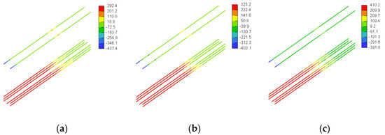 Stresses in GFRP reinforcement for models with a/h = 1.5 (MPa): (a) SDB-1.5-L, (b) SDB-1.5-M, and (c) SDB-1.5-H.