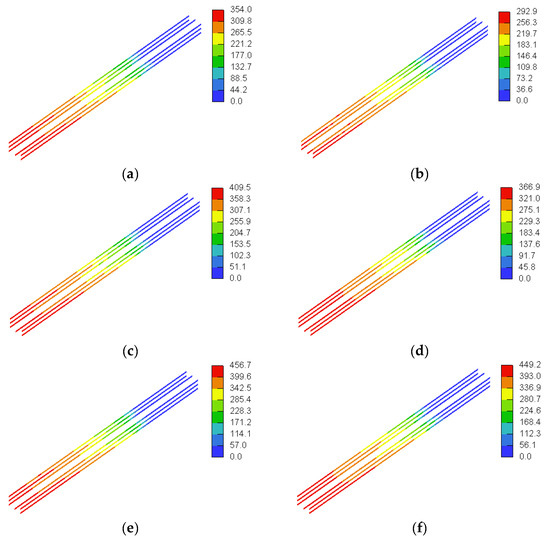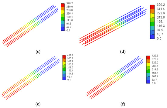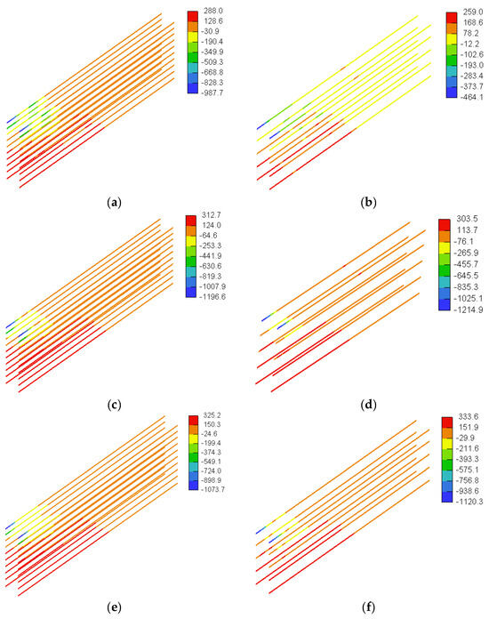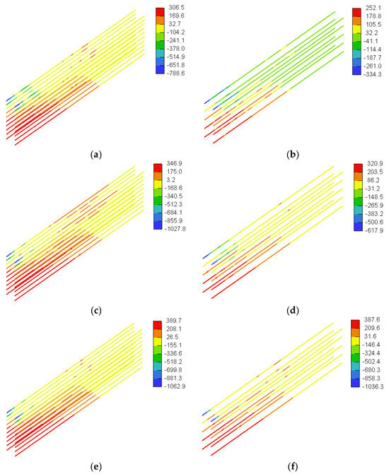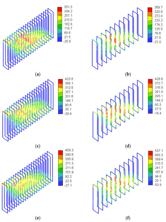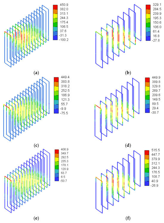 Three-dimensional view of stresses in vertical GFRP stirrups for models with a/h = 1.5 (MPa): (a) SDB-1.5-L100, (b) SDB-1.5-L200, (c) SDB-1.5-M100, (d) SDB-1.5-M200, (e) SDB-1.5-H100, and (f) SDB-1.5-H200.