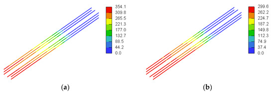 Figure 17 and Figure 18 show general 3D views of the stresses in the GFRP reinforcement predicted numerically for the beam models with a/h = 1.0 and a/h = 1.5, respectively. It is evident that the flexural GFRP reinforcement at the tension side acted as a tie because they featured a uniform stress distribution along the shear span. The beam models with the higher concrete compressive strength sustained a higher ultimate load and, hence, featured higher GFRP stresses at peak load than those of the beam models with lower concrete compressive strengths. The flexural GFRP reinforcing bars did not reach their tensile strengths in any of the beam models. For the beam models with a/h = 1 (Figure 17), the GFRP stress in the flexural reinforcement at tension side at peak load was on average 342 MPa (i.e., 34% of the tensile strength of straight GFRP bars), with a minimum of 292 (i.e., 29% of the tensile strength of straight GFRP bars) and a maximum of 410 MPa (i.e., 41% of the tensile strength of straight GFRP bars). The maximum GFRP stresses at peak load for the beam models with a/h = 1.5 were slightly lower than those of their counterparts with a/h = 1.0. For the beam models with a/h = 1.5 (Figure 18), the GFRP stress in the flexural reinforcement at tension side at peak load was on average 308 MPa (i.e., 31% of the tensile strength of straight GFRP bars), with a minimum of 256 (i.e., 26% of the tensile strength of straight GFRP bars) and a maximum of 376 MPa (i.e., 38% of the tensile strength of straight GFRP bars).