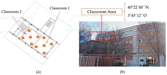 According to current regulations [33], the metropolitan area of the Community of Madrid is characterised by a temperate type C climate. All the classrooms in the building have the same orientation of windows to the east and access on the west side. In order to carry out the monitoring and periodic follow-up of the evolution of pollutants in its interior, periodic data have been collected in two classrooms located on the third floor of the building. The distribution and measurement points can be seen in Figure 1a, where the data were collected at a height of 1.2 m. In Figure 1a, it can be seen that Classroom 1 is a large space that provides access to an outdoor terrace and is ventilated at four distinct points: the entrance door to the classroom, the access door to the terrace and the classroom windows on both sides of the building, whose orientation is east–west, thus ensuring a continuous flow of fresh air. On the other hand, Classroom 2, adjacent to the previous one and with independent access through the hall, has four windows on the east side and, on the west side, only the access door to the classroom. Figure 1b shows an image of the building studied. In addition, Table 2 shows some of the most relevant data for this research regarding the configuration of the classrooms studied.