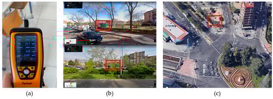 (a) Temtop M2000 2nd measuring equipment used for indoor data collection; (b) Farolillo measuring station; (c) Plaza Elíptica measuring station.