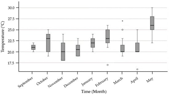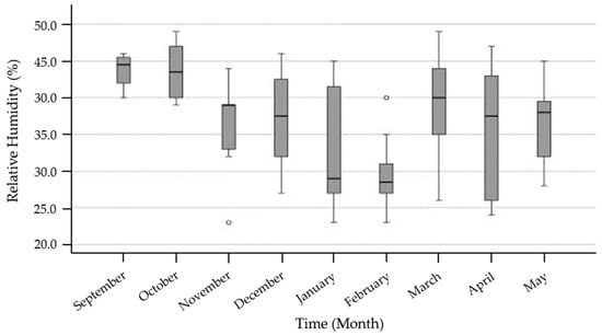Firstly, Figure 3 and Figure 4 show the descriptive values for interior humidity and room temperature in the classrooms studied. These graphs have been made with the help of Box-Plot diagrams that allow us to visualise the monthly average evolution of these parameters throughout the academic year.
