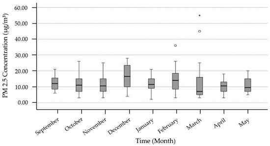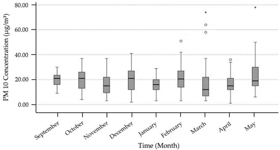 Thus, although the WHO sets the maximum permitted 24 h air pollutant concentration at 15 µg/m3 for PM 2.5 and 45 µg/m3 for PM 10, the students involved in this study were frequently subjected to episodes wherein the average concentration exceeded these recommended health limits. Concentrations of PM 2.5 were higher than 30 µg/m3 in February and 40 µg/m3 in March, which are high risk levels for people with respiratory diseases. Likewise, PM 10 exceeded the concentration of 60 µg/m3 on more than one occasion, which affected the normal course of classes.