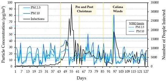 Daily evolution of the concentrations of PM 2.5 and PM 10 during the school period Sep–May and number of infected people in Madrid due to SARS-CoV-2 virus.