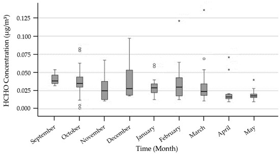 The last parameter analysed in this study was the evolution of the concentration of formaldehyde (HCHO). The monitoring of this atmospheric agent has experienced a growing interest among the scientific community as a result of the widespread use of hydroalcoholic gels in classrooms. This sanitary measure, in principle beneficial for sanitising and reducing viral contagion, leads to an increase in HCHO concentration in inadequately ventilated spaces [42]. Figure 9 shows the evolution of this parameter over the academic year under study with the help of a Box-Plot diagram.