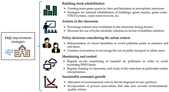 This research is a clear example of the need to rehabilitate and refurbish the ageing building stock, highlighting the damage caused to students’ health by deficiencies in the current design of some urban educational centres. In the specific case of Spain, 60% of existing housing was built before the 1980s and is still in use without having undergone any refurbishment [56]. This implies that more than half of today’s buildings were built without taking into consideration any standards that include relevant issues such as the design of air renewal systems or effective thermal insulation. For this reason, in order to improve the IAQ of existing schools located in the urban centre of the city of Madrid, it is necessary to promote a retrofitting initiative taking into consideration some relevant aspects such as those included in Figure 10.