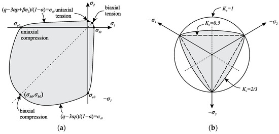 b0/σc0 is the ratio between the biaxial compression and the uniaxial compression yield stress that influences the yield surface in a state of full tension. Typical experimental values of the ratio σb0/σc0 range between 1.10 and 1.16 [32,33,34]; e are the effective cohesion stress in compression and tension, respectively. The coefficient γ appears only in triaxial compression stress states. This factor can be determined by comparing yield conditions along the tensile and compression meridians. The parameter Kc is the coefficient that defines the shape of the deviatoric cross-section, as shown in Figure 1b.