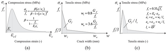 Concrete constitutive laws for tension and compression. Adapted from [29,37]: (a) Compression concrete; (b) Tensile behavior: stress × crack opening; (c) Tensile behavior: stress × strain.
