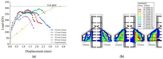 The results highlighted in Table 4 indicate the best adjustment of the dilation angle for each corbel and, in turn, that it may not be possible to generalize a single set of CDP parameters to represent all concrete classes, but rather that each specimen must have the CDP parameters studied and calibrated individually according to the class of concrete used since dilatancy is a property of the material. Furthermore, it is important to highlight that ABAQUS® uses a constant dilatancy value throughout the simulation. Still, it is known that the dilatancy value varies depending on the level of stress and strain of the concrete [35]. In practice, the dilatancy of the material reduces as the plastic deformations of the concrete increase. For this reason, it is natural that the optimum dilatancy angle for each corbel varies since each corbel fails at a different level of stress and deformation in the strut. When using the optimal dilatancy values for each corbel, Vu,num/Vu,exp = 1.00, and a coefficient of variation of just 2% were obtained.