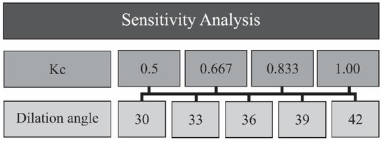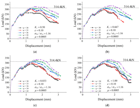 Sensitivity analysis with constant Kc and different dilation angles: (a) Sensitivity analysis with Kc = 0.50; (b) Sensitivity analysis with Kc = 0.667; (c) Sensitivity analysis with Kc = 0.833; (d) Sensitivity analysis with Kc = 1.00.