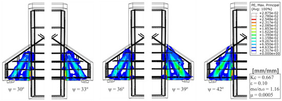 In practice, the increase in corbel strength with increasing dilatancy angle occurs due to the influence of this variable on the tri-axial stress state of the concrete. Increasing the dilatancy angle increases the transverse deformations of the concrete in the strut region (similar to Poisson’s ratio for the elastic regime), as can be seen in Figure 8. Due to the restriction of concrete deformations in the transverse direction of the strut due to the presence of seam reinforcement and the surrounding concrete itself, there is confinement of the strut for greater dilatancy angles, which increases the compressive strength of the concrete in this region and, consequently, corbels that break due to crushing of the concrete.