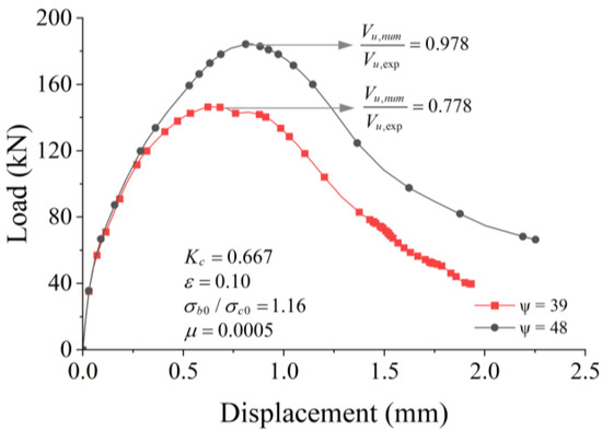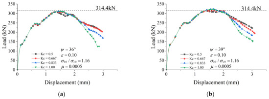 In this item, the influence of the deviatoric plane shape factor (Kc) is studied when the other CDP variables are constant. In Figure 9a,b, the results with dilation angles of 36° and 39°, respectively, are presented. What can be seen is that (Kc) has little influence on the behavior until failure, mainly affecting the post-peak section of the load × displacement curve.