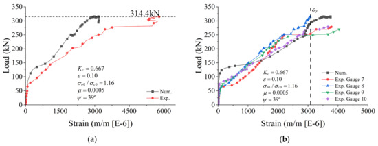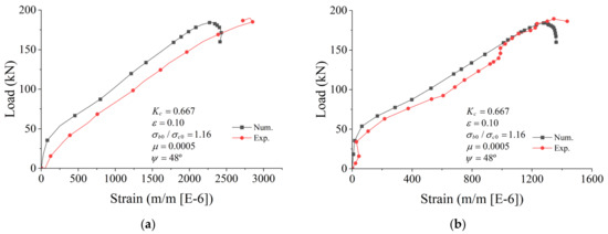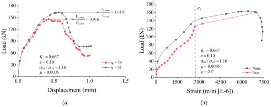 Figure 7b presents the best response among all the options analyzed, with a dilation angle of 39° and a Kc of 0.667, obtaining a ratio between numerical ultimate load (Vu,num) and experimental ultimate load (Vu,exp) of 1.003.