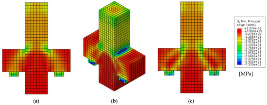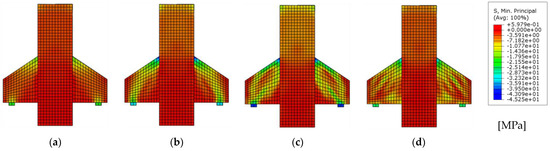 Figure 11 shows the evolution of the main compression stresses with the evolution of the load. When 250 kN of load is applied to each corbel (Figure 11b), it is already possible to observe the formation of the compression strut and the stress concentration in the nodal region of the corbel support plate. Figure 11c shows the stress distribution when the maximum load was reached, and Figure 11d shows the post-peak stresses of the console when the loading capacity exceeded the maximum limit and the stresses were redistributed, generating a less uniform distribution of stresses. Comparing Figure 11c,d, it is possible to clearly observe the formation of a bottle-shaped connecting rod (with two compressed edges and one central core pulled in the direction perpendicular to the strut) due to tensile stresses transverse to the strut.
