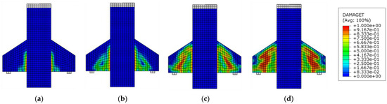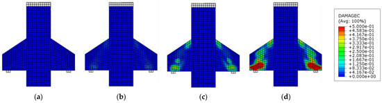 Numerical results of the damage evolution under compression of the specimen. M3-MONO-A: (a) M3-MONO-A-150kN; (b) M3-MONO-A-250kN; (c) M3-MONO-A-315kN peak; (d) M3-MONO-A-200kN post-peak.