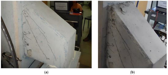 Figure 20 shows the distribution of cracks and the mode of failure of the experimentally tested FA-T8 corbel. The collapse occurred due to the yielding of the tie reinforcement, followed by the crushing of the concrete in the nodal region. The first cracks appear at the corbel–column interface, and as the load increases, diagonal cracks appear parallel to the compression strut. Finally, when the corbel reaches its maximum load capacity, the tie reaches yield, allowing a greater opening of the crack at the interface and a relative rotation between the corbel and the column, which causes the concrete to crush in the nodal region, as can be seen in Figure 20.