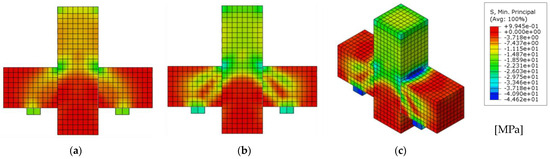 Numerical results of the evolution of the principal compressive stresses of the specimen FA-T8: (a) FA-T8-100kN; (b) FA-T8-160kN; (c) FA-T8-185kN peak.