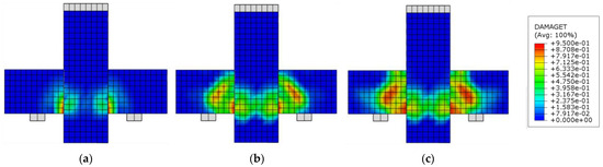 Figure 12 and Figure 13 show the evolution of tensile and compressive damage, respectively. Increased loads after reaching peak strength cause degradation in concrete. This degradation causes gradual loss of strength and is interpreted as tensile or compressive damage. Tensile damage (DAMAGET) can be interpreted as the formation of cracks as load increases, while compressive damage (DAMAGEC) relates to the crushing of concrete.