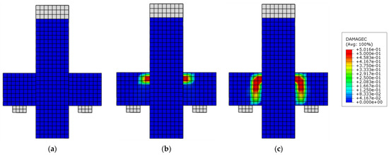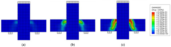 Numerical results of specimen compressive damage evolution FE SC6-4A: (a) FE-SC6-4A-100kN; (b) FE-SC6-4A-162kN peak; (c) FE-SC6-4A-90kN post-peak.