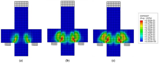 Numerical results of specimen tensile damage evolution FA-T8: (a) FA-T8-100kN; (b) FA-T8-185kN peak; (c) FA-T8-100kN post-peak.