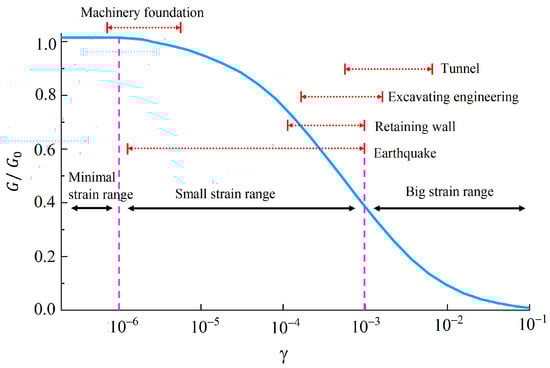 Excavation engineering is vital for the development of underground spaces in urban areas. As these excavations become increasingly deeper, larger, and more complex, it is crucial to prioritize safety, not only for the excavation itself but also for neighboring structures and infrastructure. Thus, the main focus of foundation pit support design is to control deformation and maintain stability. The continuous media finite element method has emerged as the most effective approach to assess the impact of excavations on the surrounding environment. In this context, the proper selection of a soil constitutive model and the accurate determination of model parameters are critical [1,2]. A substantial amount of field measurements and numerical simulation analyses have corroborated that the strain of soil in engineering projects is typically within the small strain range of 0.01% H to 0.3% H (H represents the depth of excavation) [3], as is depicted in Figure 1. Atkinson and Sallfors [4] categorized strain levels into three groups: very small strain levels with a constant stiffness modulus within the elastic range; small strain levels with a nonlinear variation in stiffness modulus with strain; and large strain levels where the soil approaches failure, resulting in relatively small soil shear stiffness.