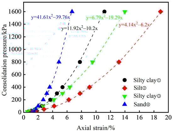 Through the standard consolidation tests conducted on the soil samples from different strata, an understanding of the relationship between consolidation pressure and axial strain was obtained. After fitting the data points, the slope of the curve at a consolidation pressure of 100 kPa was taken as the reference tangent modulus value of the soil. The R2 values for the fitted curves were all 0.99, as is shown in Figure 2. The axial strain of each specimen increased with the increase in consolidation pressure. Among the different strata typical of Zhengzhou, the reference tangent modulus value for sand ④ was the highest (14.6 MPa), while the values for silty clay ①, silty clay ③, and silt ② were 7.02 MPa, 5.58 MPa, and 4.12 MPa, respectively.