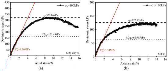 The stress–strain relationship curves of the representative strata under a confining pressure of 100 kPa are shown in Figure 4. By analyzing the stress–strain relationship curves of each representative stratum, the reference secant modulus value and the failure ratio can be obtained. The peak deviator stress achieved during soil sample failure is taken as the failure deviator stress . The slope of the straight line connecting the origin and point in the diagram represents the reference secant modulus value .