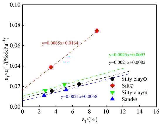 In order to reduce the influence of human factors, Liang et al. [25] proposed that the relationship curve of and can be obtained through the linear fitting of the points with 70% and 95% of , as shown in Figure 5. The reciprocals of the slopes of the fitted lines are the values of the representative strata (①–④), which were 476.19 kPa, 153.84 kPa, 400 kPa, and 476.19 kPa, respectively. The failure ratio is the ratio of the failure deviator stress to .