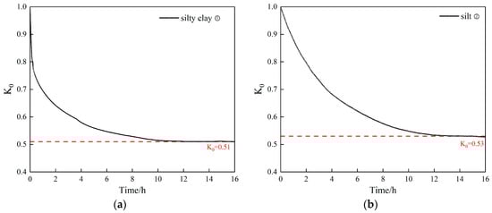 The initial static lateral pressure coefficient can be determined through K0 consolidation tests. The initial value is 1, and it gradually stabilizes and reaches its final value during the consolidation process. As the loading process progresses, the deviatoric stress continues to increase until the test is completed. The test results for the representative strata are shown in Figure 6. The values of the silt and silty clay were relatively close, ranging from 0.51 to 0.53. The value of the sand was larger (0.58).