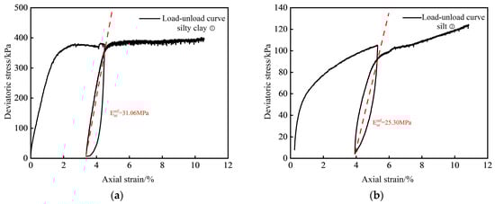 Triaxial loading–unloading test results for representative Zhengzhou soil strata: (a) silty clay ①; (b) silt ②.