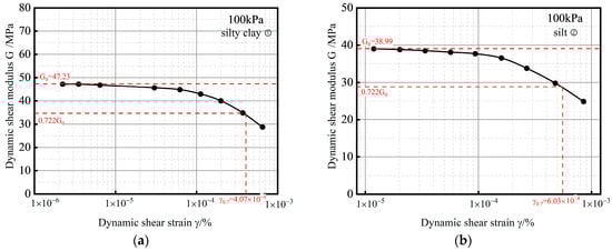 Figure 8 shows the dynamic shear modulus attenuation curves of the representative strata under a reference confining pressure 100 kPa. The small strain parameters and can be obtained from the shear modulus attenuation curves of the different representative strata. When the shear strain is 0, the maximum dynamic shear modulus is the initial dynamic shear modulus value , and the initial dynamic shear modulus value under the reference confining pressure of 100 kPa is the small strain parameter . The small strain parameter is the shear strain corresponding to 70% of .