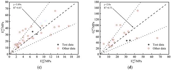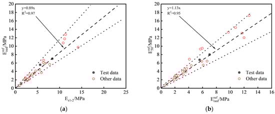 A comparative analysis was performed to compare the values of the HSS model parameters for Zhengzhou and those of other regions [29,30,31,32,33,34]. The statistical analysis results for clay are presented in Figure 9. The proportion relationships among various parameters for clay in Zhengzhou were within the range of the proportion relationships observed in other regions. The fitting results obtained using a linear regression method that involves passing through the origin align closely with the statistical analysis results. In the absence of measured model parameters, empirical values can be used as references based on their fitting relationships: = 0.89 , = 1.13 , = 3.89 , and = 2.0 . Due to the limited availability of experimental research on HSS model parameters for silt and sand, reliable statistical data are lacking. Therefore, empirical values were adopted based on the experimental results obtained in this study, and these are presented in Table 4.