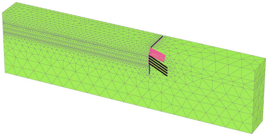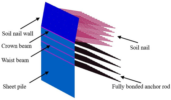 The soil element utilized in the model was a 10-node wedge shape. The model was divided into 67,499 units and 10,897 nodes. The finite element model is shown in Figure 10. The foundation pit support system used a pile-anchor composite support structure, which mainly consists of soil nails, fully bonded anchor rods, soil nail walls, sheet piles, crown beams, and waist beams. The finite element model support form is shown in Figure 11. The sheet pile and soil nail wall were simulated by a six-node triangular plate element, the waist beam and crown beam were simulated by a beam element, and the soil nail and fully bonded anchor rod were simulated by an embedded pile element. The specific parameters are shown in Table 5. It should be noted that in this case, the sheet pile support was made up of mixed piles and concrete cast-in-place piles. In order to accurately simulate the mechanical properties of sheet piles, a plate element of an equivalent thickness was used in the simulation. Finally, the whole process of the excavation of the foundation pit was simulated, including the layered excavation of the soil and the construction of the soil nails, anchor rods, and sheet piles. The excavation depth of each layer was 1.5 m, the initial groundwater level was set to -10.6 m, and the precipitation was synchronized during the excavation. Due to the level of the simulated site, the initial stress field was generated by the K0 process. The construction steps were as shown in Table 6.